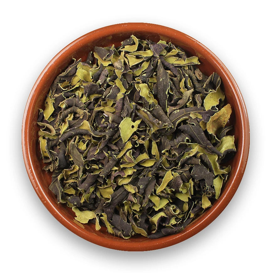 - Vorm: Gedroogde, gesneden bladeren
